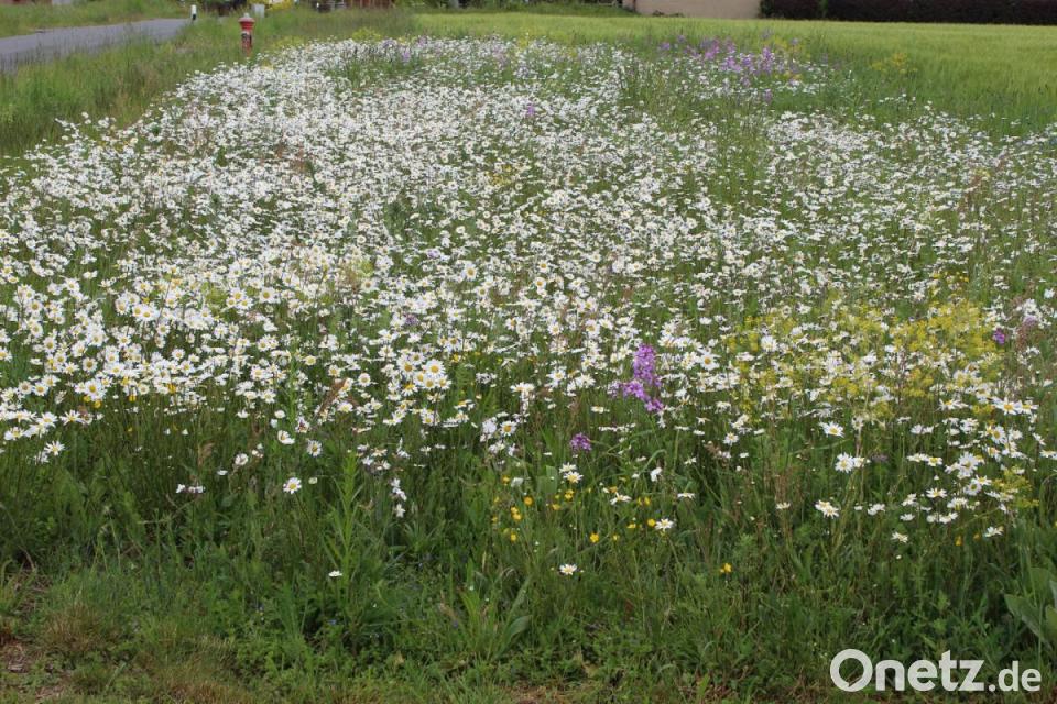Die Wiese blüht jetzt bis in den Spätherbst. Im zeitigen Frühjahr ist dann eine einmalige Pflegemahd nötig, damit einige Pflanzenarten in ihren hohlen Stängeln Winterquartier für allerlei Insekten bereithalten. Aber der weiße Margeritenteppich entschädigt die Besitzerin für die Mühen. Auch die Insekten erfreuen sich an der bunten Blütenpracht.