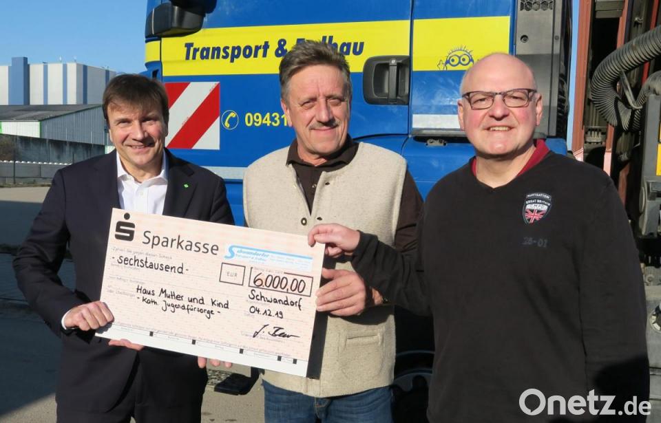 Die "Schwandorfer Transport und Erdbau GmbH" spendet seit der Gründung vor 14 Jahren jedes Jahr für einen guten Zweck. Diesmal profitiert das Haus "Mutter und Kind" in Regensburg von der Spende. Geschäftsführer Josef Beer überreichte einen Scheck über 6000 Euro an den zweiten Vorsitzenden der "Katholischen Jugendfürsorge", Michael Eibl.