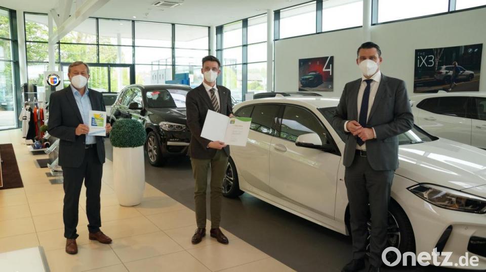 Bei dem Termin im BMW Autohaus Lell gratulierte Landrat Thomas Ebeling zum Erhalt der Urkunde, die für freiwilliges betriebliches Engagement auf dem Gebiet des Umweltschutzes verliehen wird.