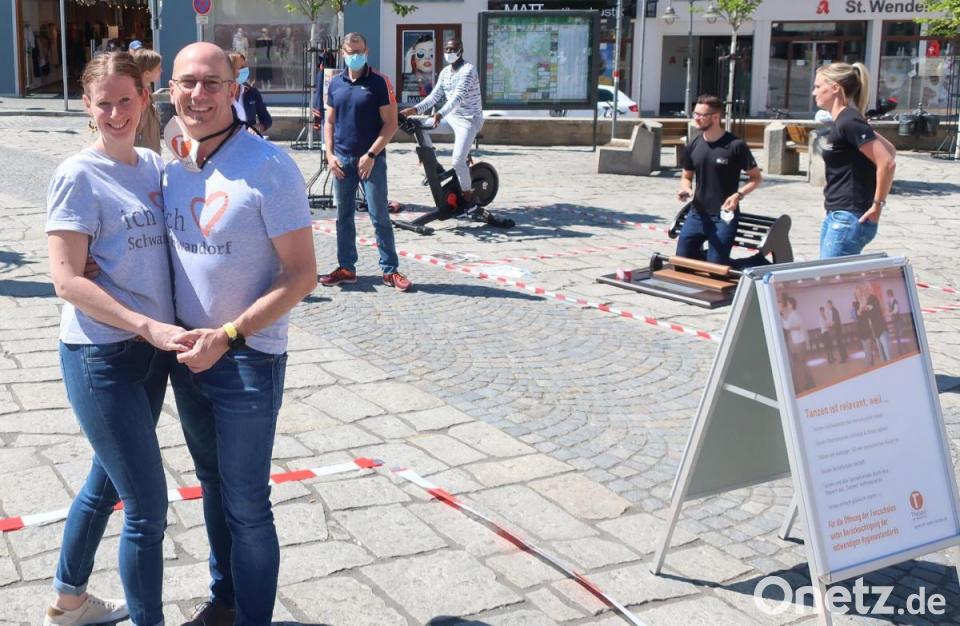 Anna und Stefan Theuerl haben ihr Tanzstudio kurzfristig "ins Freie verlegt" und auf dem unteren Marktplatz Flächen markiert. In diesem Bereich können sich die Tanzpaare bewegen, in sicherem Abstand zum nächsten Karree. "Wir beachten die Vorschriften, die uns die Politik vorgibt", erklärte Stefan Theuerl.