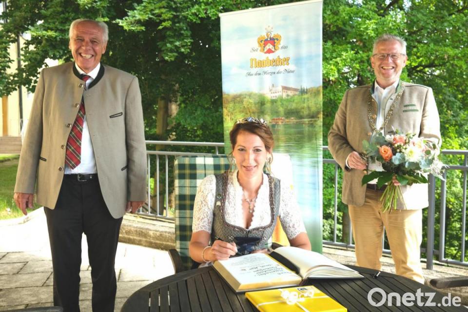 Sarah Jäger holte die Krone der Bayerischen Bierkönigin erstmals in die Oberpfalz. Oberbürgermeister Andreas Feller gratulierte der „königlichen Hoheit“ bei einem Besuch an ihrem Arbeitsplatz bei der Brauerei Naabeck und versicherte: „Die Stadt Schwandorf ist stolz auf Ihre Majestät“. Anschließend trug sich die Bierkönigin in das Goldene Buch der Stadt Schwandorf ein.