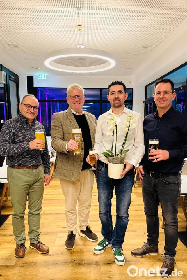 Oberbürgermeister Andreas Feller, der stellvertretende Kämmerer Peter Habermeier und Bäderleiter Michael Maget stießen gemeinsam mit Richard Krestel auf seinen Start im Hallenbad Dachelhofen an. „Ich freue mich, dass wir mit Herrn Krestel einen engagierten, versierten und sehr erfahrenen neuen Pächter gewonnen haben“, so der Oberbürgermeister. „Ich bin mir sicher, dass sein Konzept auch bei den Gästen großen Anklang finden wird, und wünsche ihm alles Gute.“