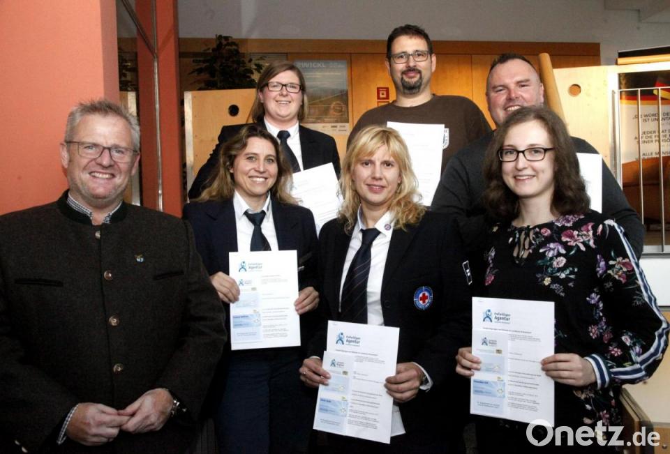 "Es soll ein kleines Dankeschön sein für Ihre ehrenamtliche Tätigkeit", versicherte Oberbürgermeister Andreas Feller den sechs Empfängern, denen er im Rathaus die "Ehrenamtskarte in Blau" überreichte. In den vergangenen acht Jahren hat die Stadt Schwandorf in Absprache mit dem bayerischen Sozialministerium insgesamt 192 Ehrenamtskarten ausgegeben. Die Version in "Blau" ist drei Jahre gültig, die in "Gold" dauerhaft. Der Jugendleiter und Kassenwart des Fischereivereins Teublitz, Josef Aumer, ist bereits Inhaber der "Juleica-Karte" des Kreisjugendrings und nun auch Besitzer der Ehrenamtskarte.