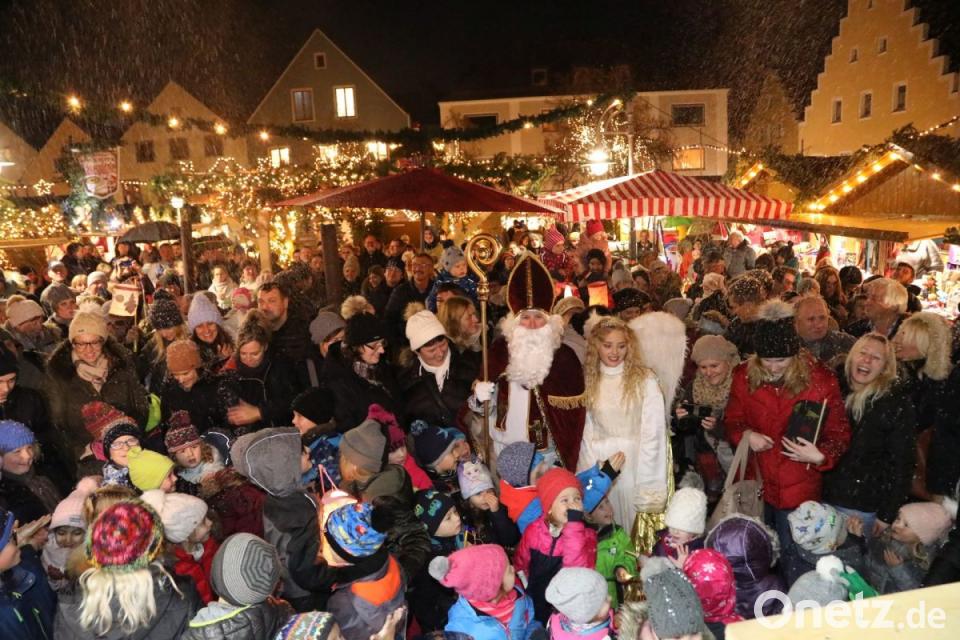 Das ist kein Wetter für einen Weihnachtsmarkt: Am Montagnachmittag tummeln sich Frauen und Männer auf dem Marktplatz - es ist nass und kalt. Egal, die Schwandorfer trotzen dem Regen. Um kurz vor 17 Uhr wird's richtig weihnachtlich. Von der Kirche St. Jakob marschieren Mädchen und Buben angeführt vom Christkind und vom Nikolaus Richtung Weihnachtsmarkt. Von der Friedrich-Ebert-Straße aus ziehen die Musiker des "Naabtaler Bläserensembles" unüberhörbar gen Bühne. Bürgermeisterin Ulrike Roidl sagt nicht zu unrecht: "Es ist schon ein schönes Bild, wenn man reinschaut in unsere kleine Budenstadt." Und plötzlich schneit es! Auf der Bühne ist eine Schneemaschine angebracht, die weiße Flöckchen in die Budenstadt bläst. O du fröhliche!