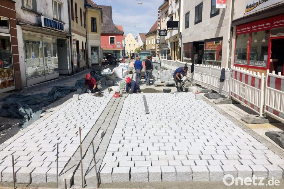 Der erste Bauabschnitt zur Sanierung der Friedrich-Ebert-Straße ist abgeschlossen, jetzt geht's weiter zwischen Berggasse und Bahnhofstraße, rund 60 Meter ist dieser Abschnitt lang. Bis Ende November soll auch hier das neue Pflaster liegen. Über den Winter ist die Einkaufsmeile wieder befahrbar. Bevor das Pflaster liegt, müssen noch Hausanschlüsse, Gasleitungen und ähnliches erneuert werden. Der Hauptkanal liegt bereits. Das Pflaster - die Steine sind 16 mal 16 mal 16 Zentimeter groß - wird auf eine rund 20 Zentimeter starke Schicht wasserdurchlässigen Trennbetons verlegt, wie Rathaus-Pressesprecher Lothar Mulzer auf Nachfrage erläuterte. Bis zum 21. September soll das Pflaster schon mal zwischen Marktplatz und Berggasse (95 Meter) fertig sein. Rund 800 000 Euro werden in diesem Jahr laut Mulzer verbaut und abgerechnet. Die gesamte Sanierung inklusive Wendelinplatz ist mit 3,2 Millionen Euro kalkuliert.