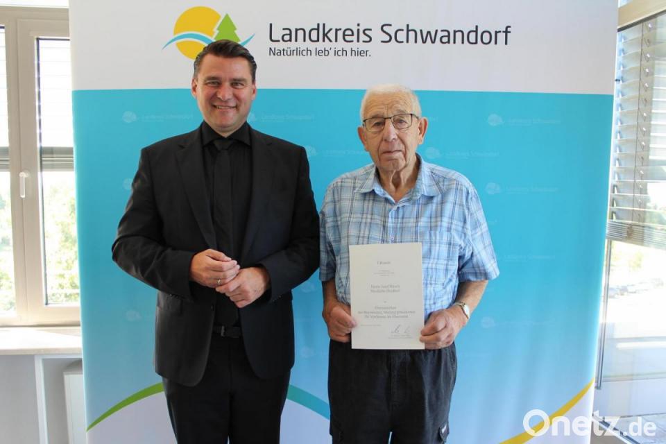 Landrat Thomas Ebeling überreichte Josef Rösch aus Birkenhöhe bei Maxhütte-Haidhof das Ehrenzeichen des Bayerischen Ministerpräsidenten. Dieses Zeichen verleiht der Freistaat Bayern für besondere Verdienste im Ehrenamt. „Es ist immer wieder schön, Menschen für ihr ehrenamtliches Engagement zu würdigen“, eröffnete der Schwandorf Landrat laut einer Mitteilung aus dem Landratsamt seine Laudatio. Schon seit mehr als 50 Jahren ist Josef Rösch Mitglied des Rassegeflügelzuchtverein Ponholz und Umgebung. Im Jahr 1972 wurde er zum Vorsitzenden gewählt und hat seither maßgeblich zum Gedeihen des Vereins beigetragen.