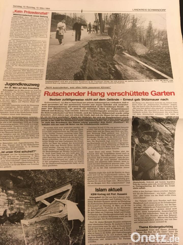 Am 11. März 1994 folgt der nächste Paukenschlag. Etwas weiter stadteinwärts als beim Dezember-Rutsch gerät der steilen Hang schon wieder in Bewegung, ein Stück Straße bricht weg und verschüttet einen Garten. Schuld soll ein kurz zuvor aufgeschütteter Kieshaufen gewesen sein. Seitdem ist es ruhig an und unter der Fronberger Straße. Die letzte größere Sanierung datiert auf 1998. Die Stützmauern wurden ausgebaut und auch neue Ver- und Entsorgungsleitungen verlegt.