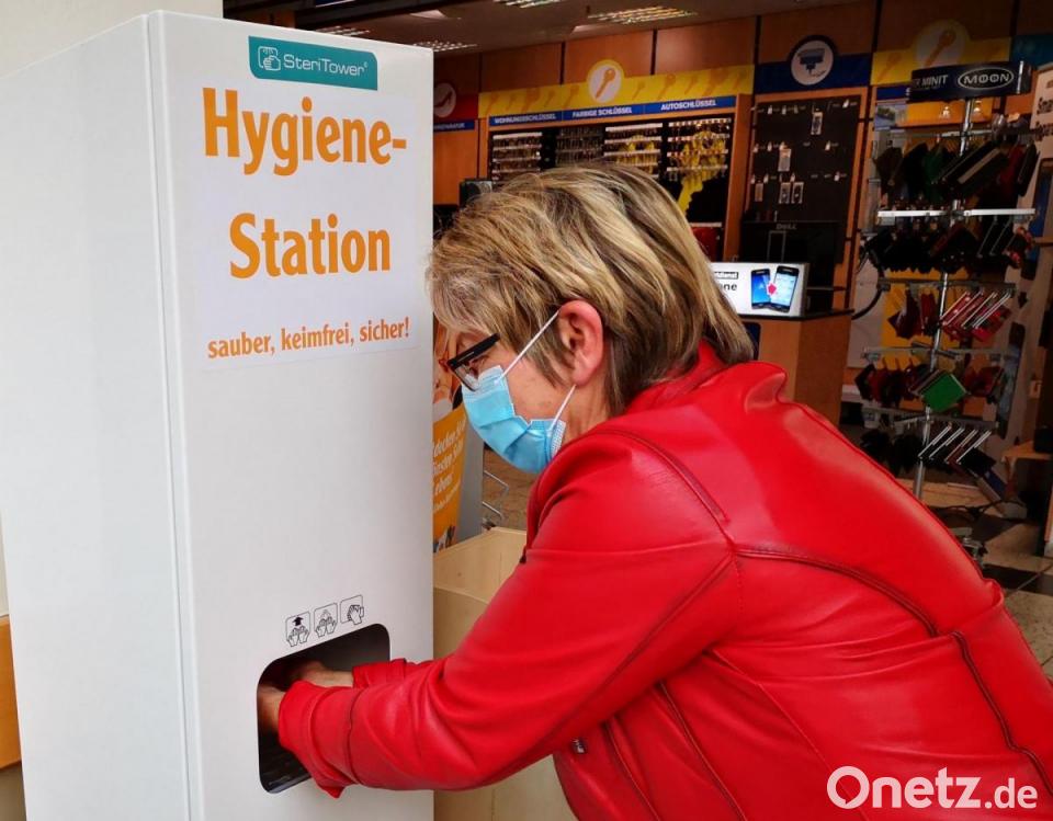 Als ganz neues Angebot stehen in den beiden Eingangsbereichen des Warenhauses zwei Desinfektions-Apparate: Man hält die Hände in eine Öffnung und Desinfektionsmittel wird durch Düsen darauf gesprüht - ohne jede Berührung. "Sie aufzustellen haben wir hier im Haus entschieden."