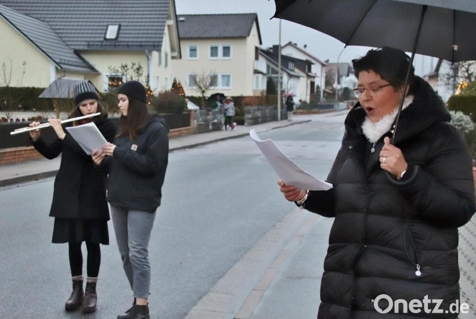 Corona-bedingt hielten die einzelnen Familien jeweils größeren Abstand voneinander und fast auf die Minute genau wurde über die Lautsprecher eines Autoradios ein "Halleluja" eingespielt. Danach gab die Ideengeberin den Ton an, laut und deutlich, und das "Oh Tannenbaum" erklang aus 40 Kehlen, begleitet von den Flötentönen zweier Mädchen, die noch schnell ihr Instrument geholt hatten.