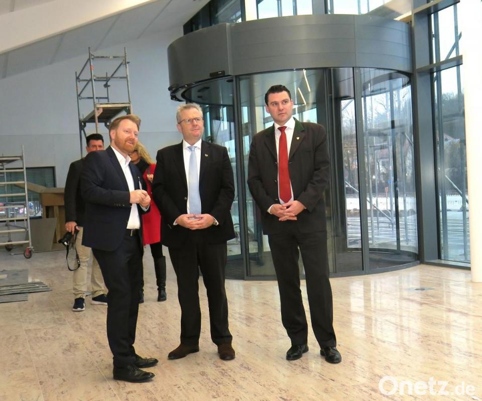 Der Geschäftsführer des Krankenhauses nahm Landrat Thomas Ebeling und Oberbürgermeister Andreas Feller mit auf die Besichtigungstour durch den Klinik-Neubau von St. Barbara, der am 11. März eingeweiht werden soll. Dazu erwartet der Träger, die Barmherzige Brüder Bayerische Ordensprovinz, auch die Staatsministerin für Gesundheit und Pflege, Melanie Huml.