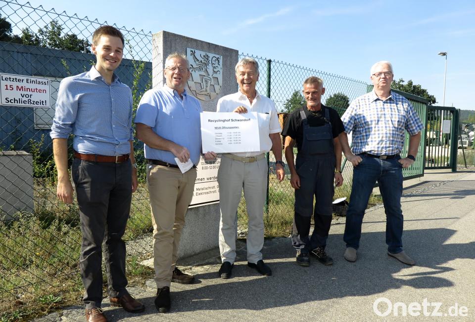 Ab 1. September treten neue Öffnungszeiten in Kraft. Statt zwölf sind es nun 28 Stunden in der Woche, in denen die Leute Sperrmüll und Gartenabfälle anliefern können. Um die gleiche Stundenzahl erhöht sich auch das Beschäftigungsverhältnis für Volker Riese und seine Mitarbeiterin. Auch der Landkreis zieht mit und erhöht das Jahresbudget für den Recyclinghof Schwandorf auf 43 000 Euro, wie stellvertretender Landrat Joachim Hanisch bei einem Ortstermin am Freitag bestätigte. Mit einem "kleinen finanziellen Anteil" sei auch die Stadt Schwandorf beteiligt, versicherte Ordnungsamtsleiter Stefan Schamberger. Oberbürgermeister Andreas Feller erwartet von den längeren Öffnungszeiten eine Entzerrung. "Die Leute haben immer öfter ihren Unmut über die langen Wartezeiten geäußert", so der Oberbürgermeister. Die Stadt reagiere nun auf die Kritik und sperre an vier Tagen bereits um elf Uhr auf. Auch für Volker Riese und seine Mitarbeiterin bedeutet das neue Angebot weniger Stress. Er kann sich dem einzelnen Anlieferer besser widmen.