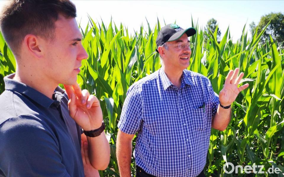 In Schwandorf stellte sich der junge Landwirt Mathias Dirmeier (20) in den Dienst der Sache und lud zusammen mit dem Bauernverband zu einem Ortstermin neben der Südosttangente (Hans-Kraus-Allee) ein, wo der Betrieb seines Vaters Norbert ein Feld besitzt, auf dem derzeit Futtermais wächst. Da der Boden leicht moorig ist, finden die Pflanzen auch in der aktuellen Trockenheit noch Wasser und stehen vergleichsweise gut da. Genauso gut aber wächst dort das Unkraut (die Landwirte sagen: die Beikräuter) Melde, Distel, Kamille oder Hirse. Wenn man ihr Wachstum nicht rechtzeitig mit passenden Herbiziden hemmt, überwuchern sie problemlos den Mais.