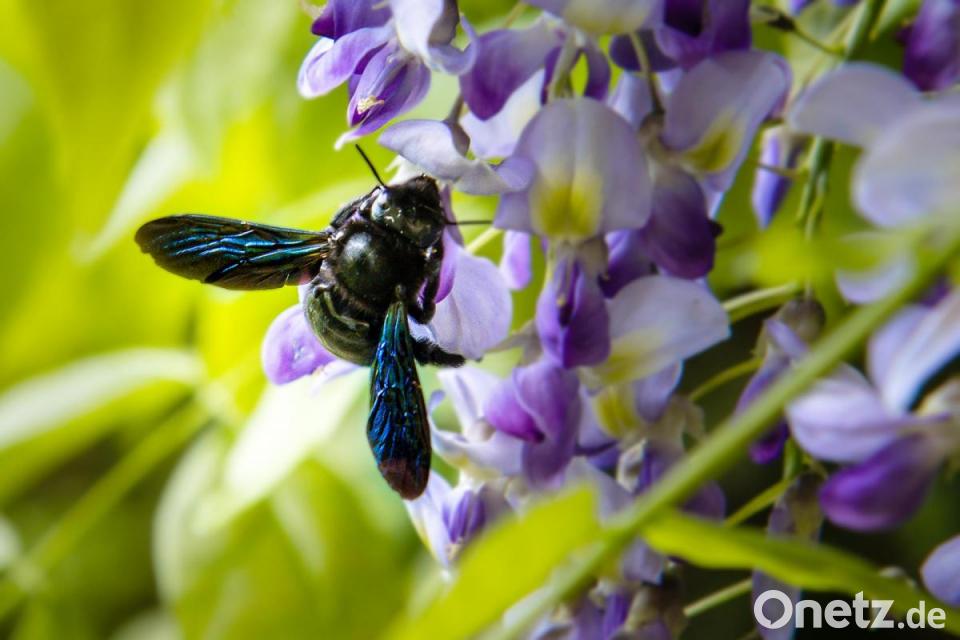 Die Holzbiene wird bis zu 30 Millimeter lang. Die Wildbiene ähnelt nur auf den ersten Blick einer großen Hummel. Der Körper ist schwarz, auch die Flügel sind dunkel. Sie schillern, je nach Lichteinfall, blau-schwarz. Xylocopa violacea bevorzugt warme Standorte. Die Solitärbiene nagt ihre bis zu 30 Zentimeter langen Nistgänge in mürbes Totholz. Die Insekten ernähren sich von Nektar und Pollen. Den Blauregen schätzen sie besonders - durch ihr Gewicht und ihren Rüssel gelangen sie besonders gut durch die Blüte an den Nektar. Die Holzbiene gilt als friedfertig, auch wenn sie durch ihr lautes Brummen Respekt einflößt.