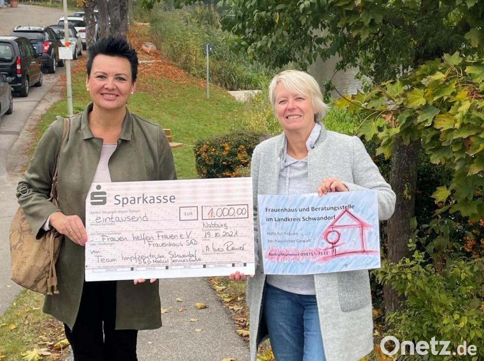 Die Geldspenden aus der Schwandorfer Bevölkerung an die Mitarbeiter des Impfzentrums in Nabburg bleiben im Landkreis Schwandorf. Das Team von D&G Services GmbH beschloss, das Trinkgeld, das seit Januar gesammelt wurde, einem guten Zweck im Landkreis zukommen zu lassen und spendete 1000 Euro an Frauen helfen Frauen e.V./Frauenhaus Schwandorf.