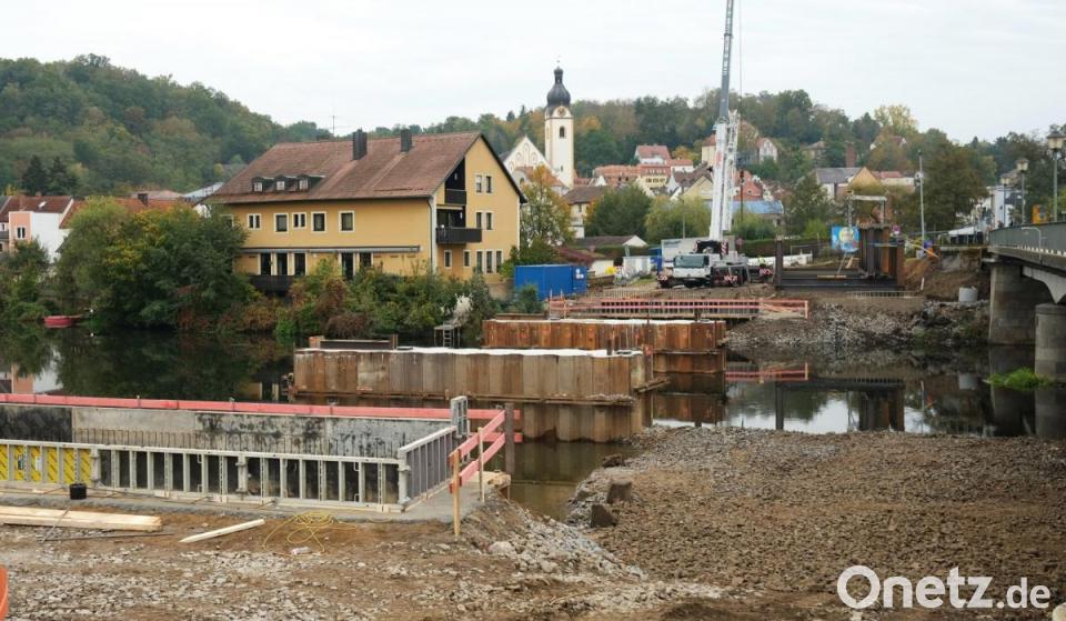 Die Behelfsbrücke über die Naab von der Fronberger Straße zur Wöhrvorstadt in Schwandorf ist eingesetzt, nun folgt der zweite Abschnitt herüber zum Ortsteil Krondorf. Gleichzeitig entsteht eine Rampe, über die der Verkehr zurückfließt auf die Staatsstraße 2397 in Richtung Amberg. Die Fertigstellung der 120 Meter langen Behelfsbrücke ist für Dezember geplant.
