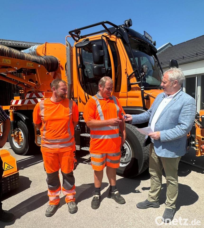 Der Unimog U535 hat laut einer Mitteilung der Stadt Allradantrieb, 354 PS und ein zulässiges Gesamtgewicht von 16,5 Tonnen. Im Sommer vereinfacht es die Mäharbeiten an den städtischen Straßenzügen und Grünflächen enorm: „Da der Unimog U535 in der Lage ist, gleichzeitig den Front- und Heckmähbetrieb durchzuführen, können wir in einem Arbeitsgang zwei Bahnen gleichzeitig mähen, was sowohl Zeit als auch Geld spart“, erklärte Bauhofleiter Michael Übel Oberbürgermeister Andreas Feller bei der Schlüsselübergabe.