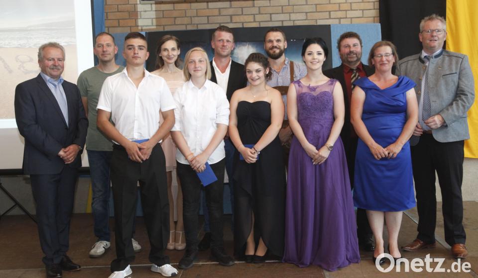 Die Lehrerband mit Jonathan Farnbacher, Marleen Berger und Martin Kristel gestalteten die Abschlussfeier musikalisch. Elternbeiratsvorsitzende Maria Semen hatte bereits einen Zuschuss für die Abschlussfahrt nach Hamburg gegeben und überreichte nun den besten Absolventen ein Geschenk. Michel Merkl (9a, 2,1), Andrea Beer (9G, 1,7), Luisa Götz (9G, 1,8), Donik Lleshi (Praxisklasse, 1,2), Mohammed Cheiko (9Ü, 1,6). 32 Schüler haben die Prüfungen zum qualifizierenden Hauptschulabschluss bestanden. Drei wechseln in den M-Zug, einer geht an die Wirtschaftsschule, zehn an die Berufsfachschule für Hauswirtschaft und Altenpflege und 24 beginnen eine Lehre als Industriemechaniker, Lagerist, Kfz-Mechatroniker, Friseur, Bürokaufmann oder zahnmedizinische Fachangestellte.