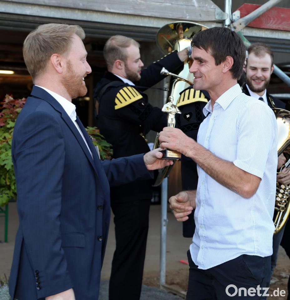 "Hier sollen Kranke Heilung finden, geplagt von Leiden vorn und hinten. Und wenn vorbei ist dann die Pein, kehrt man gesundet wieder heim", reimte Johannes Messer in seinem Richtspruch. Für ihn hatte Baumann ein besonderes Präsent parat: Der Bauleiter ist das "Gesicht" des Bau-Blogs, in dem sich Interessierte über den Fortgang der Maßnahme im Internet informieren können. Als "Hauptdarsteller in der Sparte Rohbau" sei Messer bei der Oscar-Verleihung übergangen worden. Das holte Baumann nun nach und überreichte eine Nachbildung des Awards.