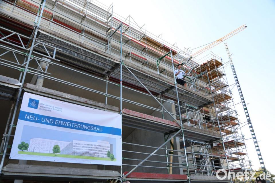 "Das brauchen wir nicht noch mal", sagte Baumann am Dienstag. "Wir stehen in der Mitte der Bauzeit und am höchsten Punkt", sagte der Geschäftsführer, als Bauherr dürfe man sich glücklich schätzen, wenn so professionell gearbeitet werde. Deshalb galt Baumanns größter Dank auch den anwesenden Handwerkern. Das größte Krankenhaus des Landkreises bekommt ein völlig neues Gesicht. Es entstehen eine neue Eingangshalle und eine sogenannte Elektivaufnahme. Außerdem finden zwei neue Allgemeinstationen Platz. Dazu eine moderne Intensivstation mit 22 Plätzen und eine angeschlossene "Intermediate Care"-Einheit zur optimalen Versorgung schwer kranker Patienten. Schließlich wird die Versorgung an St. Barbara durch eine Akutgeriatrie mit 30 Betten weiter ausgebaut.