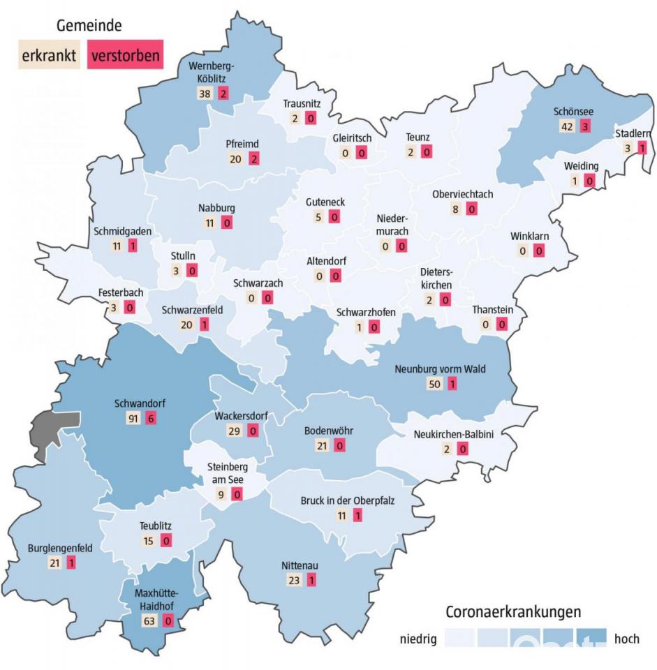 Auch bei den Todesfällen war Schwandorf bisher am stärksten betroffen. Hier starben sechs Personen mit oder an Corona. Drei Tote hatte Schönsee zu beklagen, jeweils zwei Fälle waren in Pfreimd und Wernberg-Köblitz zu verzeichnen.