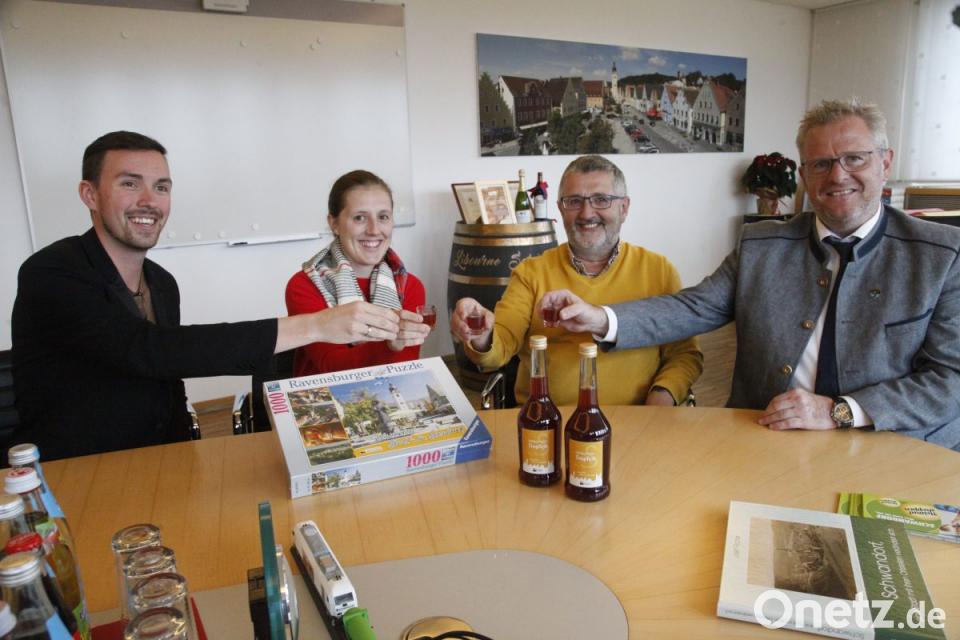 Auf den "Türmertrunk" und den "Felsenkellerlikör" folgt nun der "Schwandorfer Tropfen". "Sehr bekömmlich", stellt Oberbürgermeister Andreas Feller fest. Der Likör aus Beeren, Trauben und Gewürzen stammt aus der Konditorei Brunner und ist in 0,5-Liter-Flaschen zum Preis von zehn Euro im Tourismusbüro zu haben. Gemeinsam mit Johannes Lohrer, dem Leiter des Tourismusbüros, durfte der OB den "Schwandorfer Tropfen" als Erster probieren.