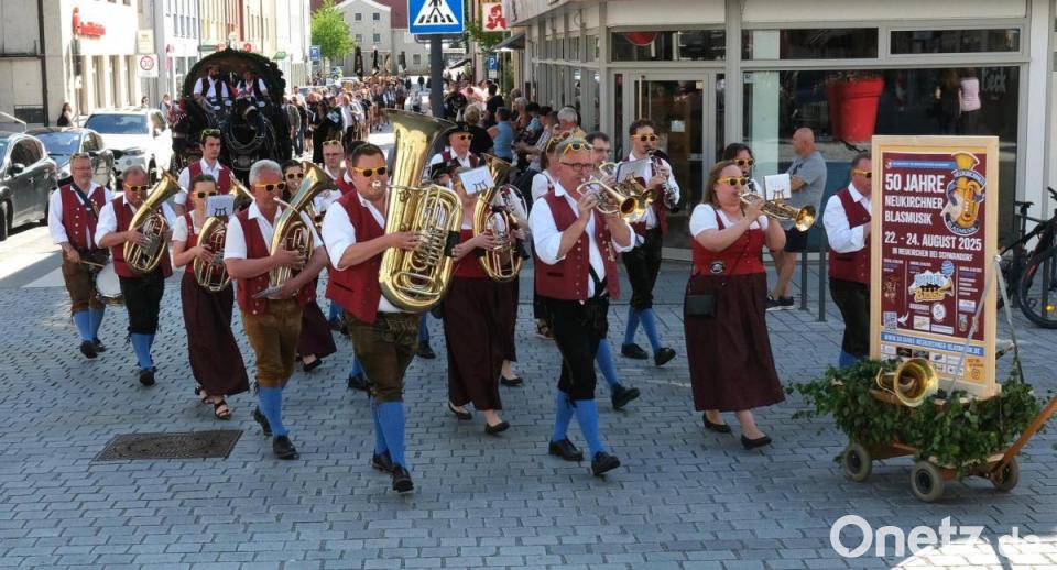 Drei Musikkapellen begleiteten den Zug und spielten abwechselnd im Zelt. Der Musikverein Dachelhofen stimmte ein Geburtstagsständchen für seinen Vorsitzenden und Dirigenten an. Als Willkommensgruß an die Delegation der tschechischen Partnerstadt Sokolov spielte die Jugendblaskapelle der Volkshochschule die Egerländer Polka "Böhmischer Traum". Die Neukirchener Blasmusik leitete mit einem Tusch den offiziellen Teil ein.
