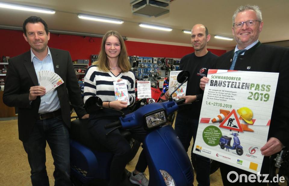 "Wir haben die zweite Auflage etwas modifiziert", erklärte City-Manager Roland Kittel bei der Vorstellung der neuen Aktion im Zweiradgeschäft von Peter Hartl. Diesmal sind auf einer Karte nur zehn Stempel erforderlich. Von der Halbierung der Anzahl verspricht sich Roland Kittel eine größere Akzeptanz. Beim ersten Mal befanden sich 186 Teilnehmerkarten in der Lostrommel. Carola Lotter hieß die glückliche Gewinnerin eines E-Mountain-Bikes im Wert von 2000 Euro. Diesmal geht es um einen Motorroller, gesponsert von Zweiradhändler Peter Hartl.