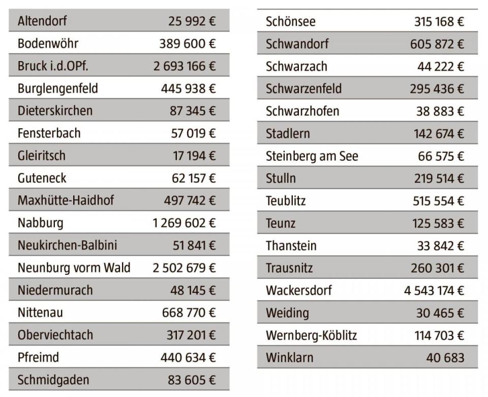 An der Staatshilfe, die fehlende Gewerbesteuer kompensieren soll, partizipieren alle 33 Städte und Gemeinen innerhalb des Landkreises. Denn der Steuerfall wird jede Kommune treffen. Die größten Beträge gehen nach Wackersdorf (rund 4,5 Millionen Euro), Bruck (2,7 Millionen) und Neunburg vorm Wald (2,5 Millionen). Aber auch Nabburg liegt mit 1 269 602 Euro noch im siebenstelligen Bereich. Landtagsabgeordnete Annette Karl und Bundestagsabgeordnete Marianne Schieder (beide SPD) gaben die vom Bayerischen Finanzministerium veröffentlichten Ausgleichsleistungen bekannt. Beide freuten sich über den pauschalen Ausgleich für die Mindereinnahmen bei der Gewerbesteuer im Jahr 2020 infolge die Corona-Krise. Der Freistaat Bayern stellt 1,3 Milliarden Euro zur Verfügung, die mit 1,1 Milliarden vom Bund auf insgesamt 2,4 Milliarden Euro aufgestockt werden. Für die beiden SPD-Abgeordneten ist allerdings klar, dass auch für 2021 ein Ausgleich erforderlich sein wird.