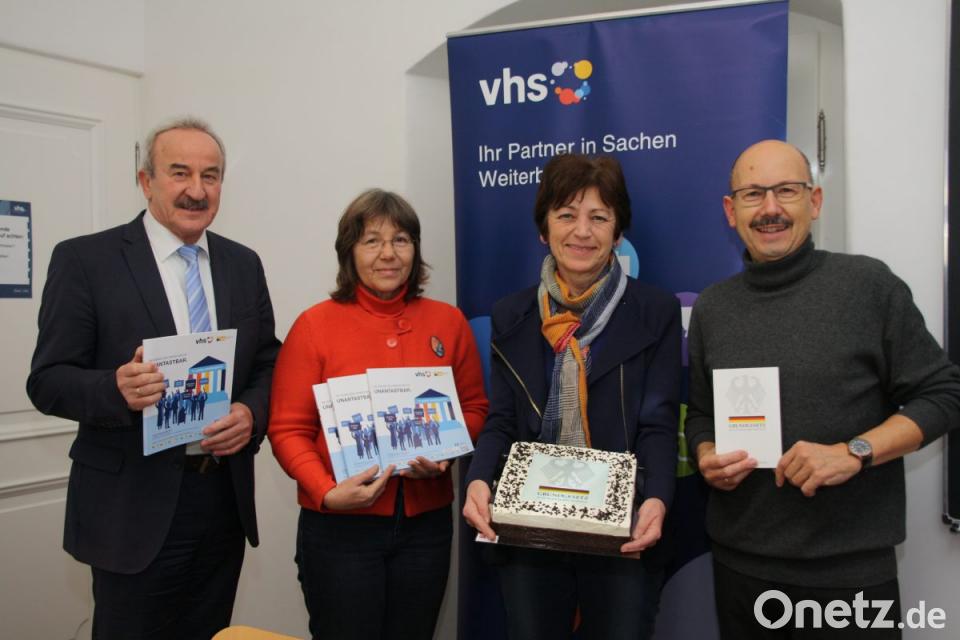 Das Grundgesetz schmeckt nach Banane, Sahne und Schokolade. Bei der Vorstellung des neuen VHS-Programms am Donnerstag haben die Verantwortlichen eine Torte mit Bundesadler, den Farben der Deutschland-Flagge und dem Schriftzug "Grundgesetz" kredenzt. Bürgermeisterin Ulrike Roidl erklärte bei dem Termin: "Auch wenn das Grundgesetz bereits sieben Jahrzehnte alt ist, es ist aktueller denn je." In den Sozialen Netzwerken vermisse sie etwa die Wertschätzung der Mitmenschen. Für VHS-Geschäftsführer Erhard Seiler sei es umso wichtiger, dass in den Kursen Menschen unterschiedlicher Kulturen, Religion und Nationalität zusammenkommen. "Wir lassen das Grundgesetz lebendig werden. Die Demokratie wird hier mehr oder weniger wieder eingeübt", erklärte er.