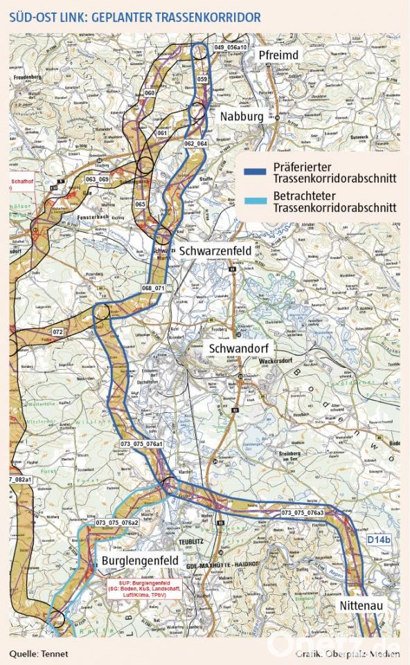 Bereits im Dezember war der Vorschlagskorridor zwischen Hof und Pfreimd veröffentlicht worden. Am Donnerstag stellte Tennet nun in Regensburg seine Vorzugstrasse zwischen Pfreimd und dem Raum Landshut vor. Tennet-Sprecher Markus Lieberknecht sprach von über 100 Kriterien, die bei der Entscheidung miteingeflossen sind. Die wichtigsten seien der Naturschutz, der Schutz von Wohngebieten, die technische Realisierbarkeit und die Kosten. Die Gleichstromtrasse werde einmal 15 Meter breit sein, für die Bauarbeiten werde allerdings ein bis zu 30 Meter breiter Streifen benötigt.