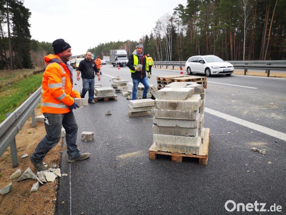 Von den Hilfskräften, unter anderem der örtlichen Feuerwehr, konnte nach einiger Zeit einer der Fahrstreifen frei gemacht werden, so dass der Verkehr wieder fließen konnte. Bis gegen 11.40 Uhr waren Helfer damit beschäftigt, die Gehwegplatten von der Straße zu beseitigen, dann war die Autobahn wieder frei. Laut Hauptkommissar Scharl entstand an dem Lastwagen ein Schaden von rund 20 000 Euro, an den Leitplanken von 5000 Euro und am beteiligten Auto von 500 Euro.