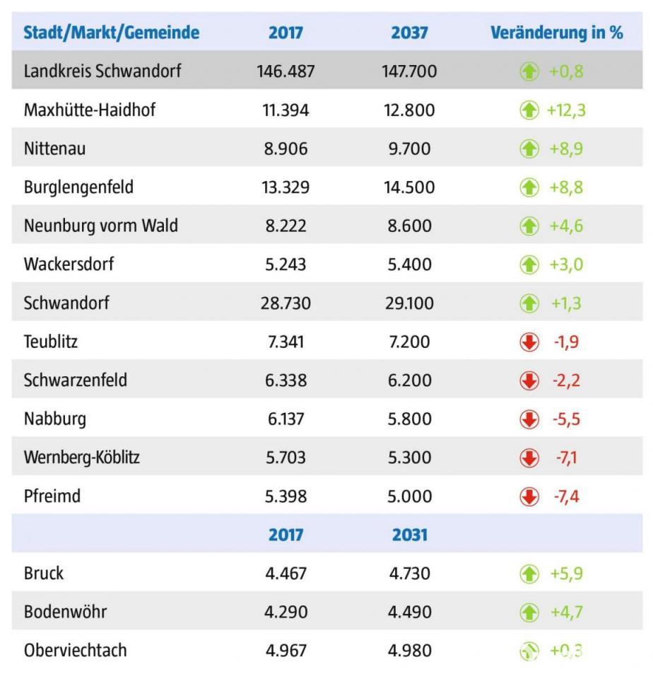 Nach der aktuellen Bevölkerungsvorausberechnung des Landesamtes vom Dezember 2018 hat der Landkreis mit einer Zunahme von 0,8 Prozent, auf 147 700 Menschen bis zum Jahr 2037 stabile Aussichten, wenn die Prognosen der Statistiker zutreffend sind. Der demografische Wandel wird aber auch im Landkreis Schwandorf das Bevölkerungsbild grundlegend verändern und Auswirkungen auf alle Lebensbereiche haben – von Kindergärten über Schulen über Gesundheitsversorgung bis zu den Bereichen Mobilität, Wohnen und Pflege. Ende 2017 waren rund 30 000 Menschen (20 Prozent) im Landkreis Schwandorf 65 Jahre oder älter. Das ist nahezu jeder Fünfte. Und es werden voraussichtlich mehr.