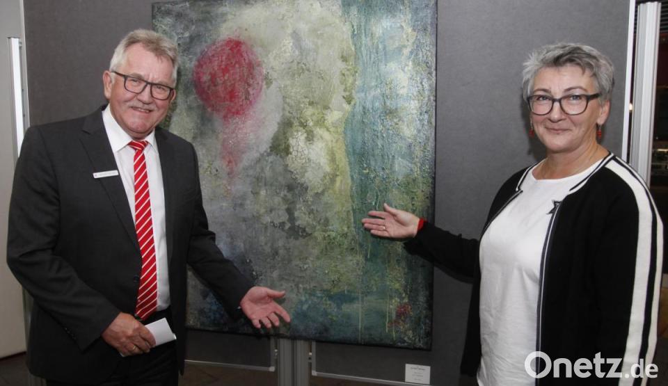 Manuela Gsödl zeigt 34 Bilder mit Tier-, Landschafts- und Aktmotiven sowie gegenständliche und abstrakte Malerei. Ihr Lieblingsbild trägt den Titel "Zur Ruhe kommen", ist 100 mal 120 Zentimeter groß und mit Acryl und Pastellkreide auf Leinwand gemalt. Gemeinsam mit dem Vorstandsmitglied der Sparkasse, Wilfried Bühner, präsentierte sie das Bild bei der Eröffnung den Gästen auf dem Marktplatz der Sparkasse. Wer Interesse an der abstrakten Komposition hat, kann sie für 420 Euro erwerben.