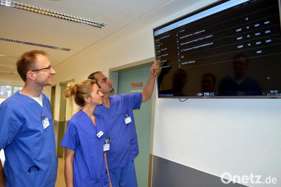 Diese Informationen werden noch während der Fahrt an das korrespondierende IT-System im Krankenhaus St. Barbara geschickt. In der Notaufnahme empfängt einen "NIDA" in Form eines großen Monitors, der an der Wand hängt. Auf diesem Board - ähnlich wie an Flughäfen und Bahnhöfen - ist für alle Beteiligten ersichtlich, welche Patienten mit welchen Verletzungen oder Erkrankungen gerade auf dem Weg sind.