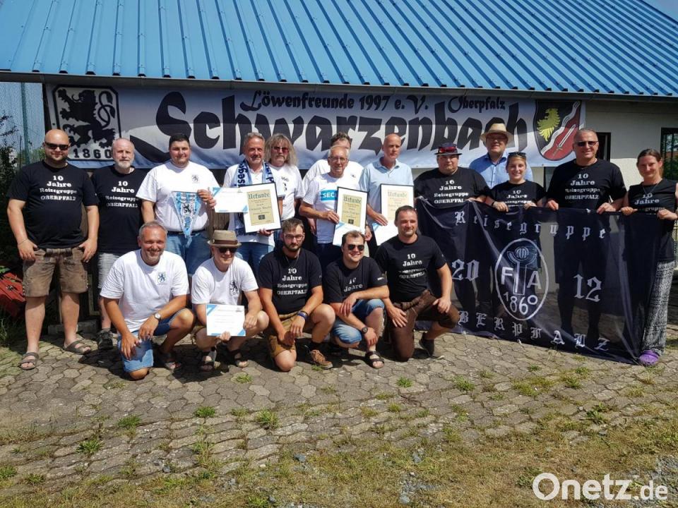 Bei tropischen Temperaturen feierten die Löwenfreunde Schwarzenbach ihr 25-jähriges Gründungsjubiläum. Zusammen mit der Reisegruppe Oberpfalz, die auf zehn Jahre Bestehen zurückblicken kann, hatte man ein tolles Fest organisiert. Die Verantwortlichen um Vorstand Florian Stefan konnten am Sportheim des SC die beiden Präsidenten des TSV 1860 München, Robert Reisinger und Hans Sitzberger, begrüßen. Bereitwillig stellten sich die Gäste den Fragen der Löwenfans aus der Oberpfalz. Rupert Seitz moderierte geschickt die kurzweilige Fragestunde, in der besonders Präsident Robert Reisinger ausführlich auf viele Fragen, insbesondere die Zukunft im Grünwalder Stadion betreffend, einging.