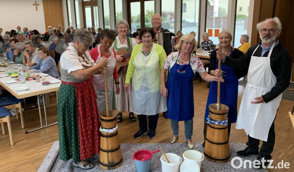 Musikalisch umrahmt wurde der Nachmittag von Anton Reiger und Marita Lobenhofer, die auch das Buttergebet, zusammen mit allen Anwesenden sprach, das vorher erlernt wurde. Das Ausbuttern begann, und in kürzester Zeit war der Kühlschrank im Pfarrheim voll mit vielen Butterkugeln. Danach bekamen alle die frisch gestampfte Butter, Brot und warme Kartoffeln zum Verspeisen sowie eine Buttermilch, die allen vorzüglich schmeckte.