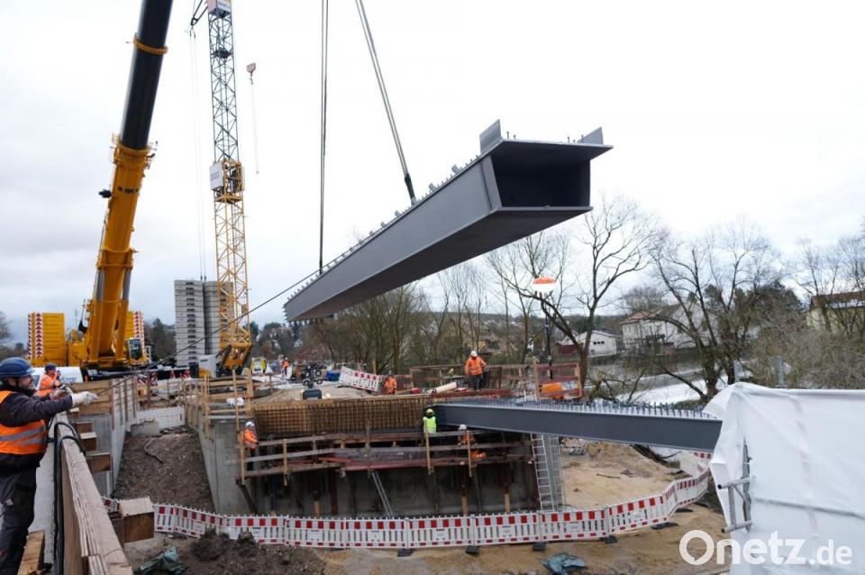 Eine wichtige Etappe ist geschafft: Mit dem Anbringen und Einsetzen der Brückenträger am Wochenende ging ein wesentlicher Bestandteil der Brückenerneuerung über die Naab in Schwarzenfeld von statten. Bereits im September vergangenen Jahres wurde beim Metallfachbetrieb für Brückenbau, der Firma Rädlinger in Cham, mit der Produktion der überdimensionalen Stahlkonstruktionen begonnen.