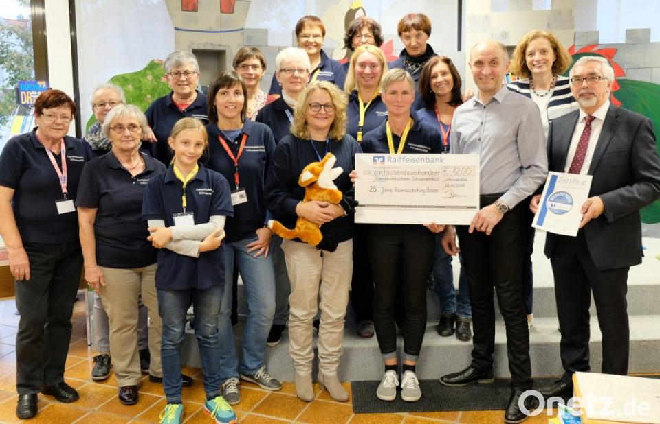 Zum Jubiläum gab es auch eine besondere Überraschung: Ursula Pusch überreichte das "Goldene Gütesiegel" und erläuterte die 15 hoch gesteckten Kriterien, die dafür zu erfüllen sind. "Schwarzenfeld hat 14 davon erfüllt", betonte sie. Einen Scheck über 1200 Euro aus einer Sammelaktion zum 25-jährigen Bestehen von Raumausstattung Bauer überreichte Firmeninhaber Josef Bauer an das Büchereiteam. Auch er lobte dessen großes Engagement.