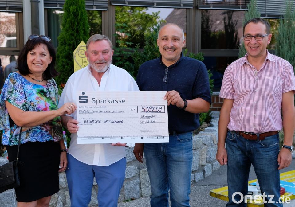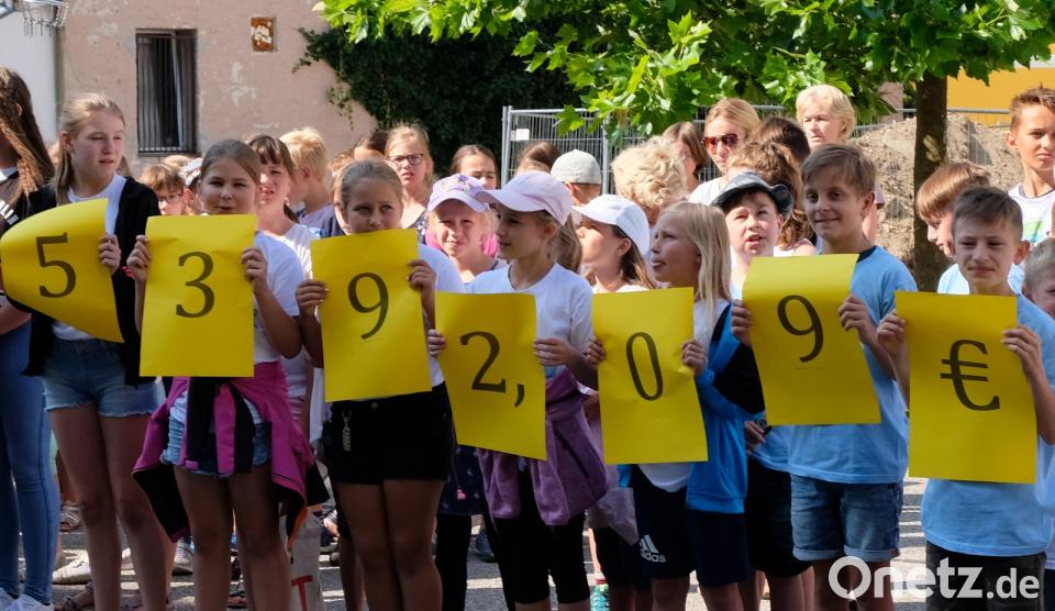 Mit diesem Ereignis verbunden war auch eine Spendenaktion, bei der gesammelte Punkte an den einzelnen Stationen in Bargeld umgewandelt wurden. Den Hauptorganisatoren Heidi Eichinger und Martin Gradl kam nun die Aufgabe zu, die Summe zu verkünden und an den Bezirksjugendleiter des Bayerischen Fußballverbandes, Karl Fenzl, weiterzuleiten. Schulsozialprojekte im Peru und Mosambik, sowie die Kinder der veranstaltenden Schule werden die Empfänger eines Betrages von gesamt 5392,09 Euro sein. Möglich gemacht hatte diesen Erfolg neben vielen anderen Helfern der Hauptsponsor, die Versicherung "Die Bayrische", die durch Stefan Harmsen vertreten war.