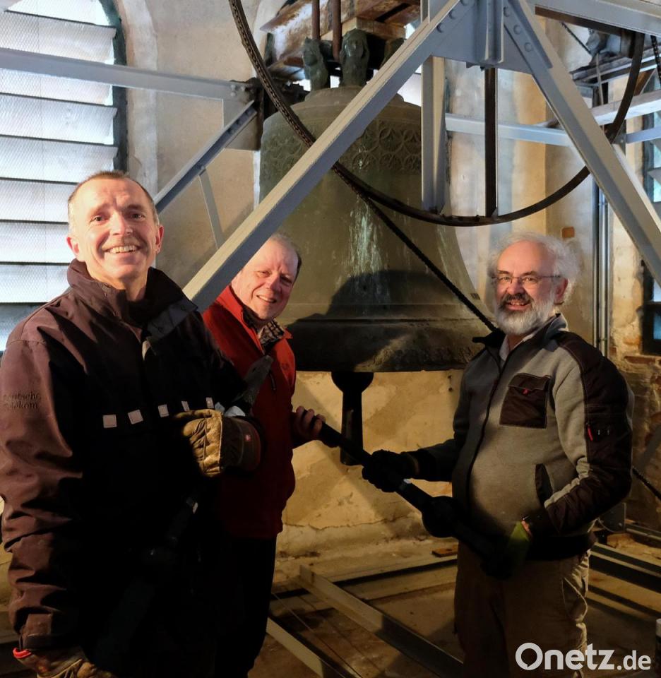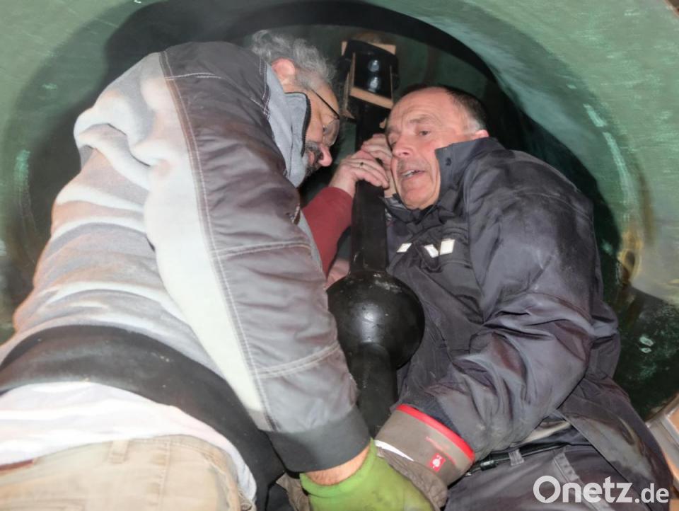 Hinzu kommt, dass die Aufhängungen mit Anbauteilen der Klöppel altersbedingt erneuert werden mussten. Seit Anfang dieser Woche kann man es wieder hören, das Geläut, das über die Dächer des Marktes schallt und Zeit sowie die Gottesdienste ankündigt. Eng und steil ging es teils senkrecht hinauf über die Steigeisen bis zum Glockenstuhl zu dem die vier bis zu 36 Kilo schweren Metallklöppel gebracht werden mussten. Pfarrer Heinrich Rosner, Peter Irlbacher und Michael Koch hatten zusammen mit Manfred Bäumler die Aufgabe übernommen, diese schweißtreibende Arbeit zu übernehmen, um mit dem Facharbeiter der Firma Perner die Klöppel in die Glocken einzuhängen.