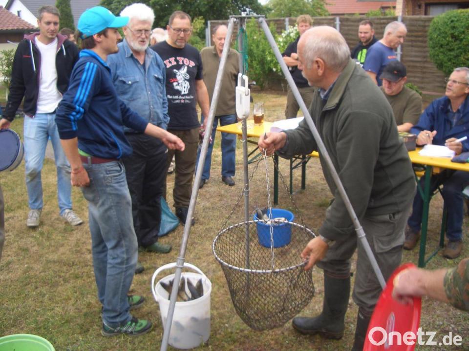 Nach dem Hegefischen wurde abgewogen. Die Fische werden für das große Anglerfest am kommenden Wochenende im Schlosspark benötigt. Der Fischerkönig wird bis dahin geheim gehalten. Die Sportangler konnten stolze 341,85 Kilogramm Fisch an Land ziehen. Die Ausbeute bestand zu 85 Prozent aus Brachsen. Nur sehr wenige Karpfen und andere Weißfische waren am Haken. Von den Altanglern waren 29, von den Jungangler vier erfolgreich.