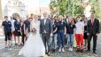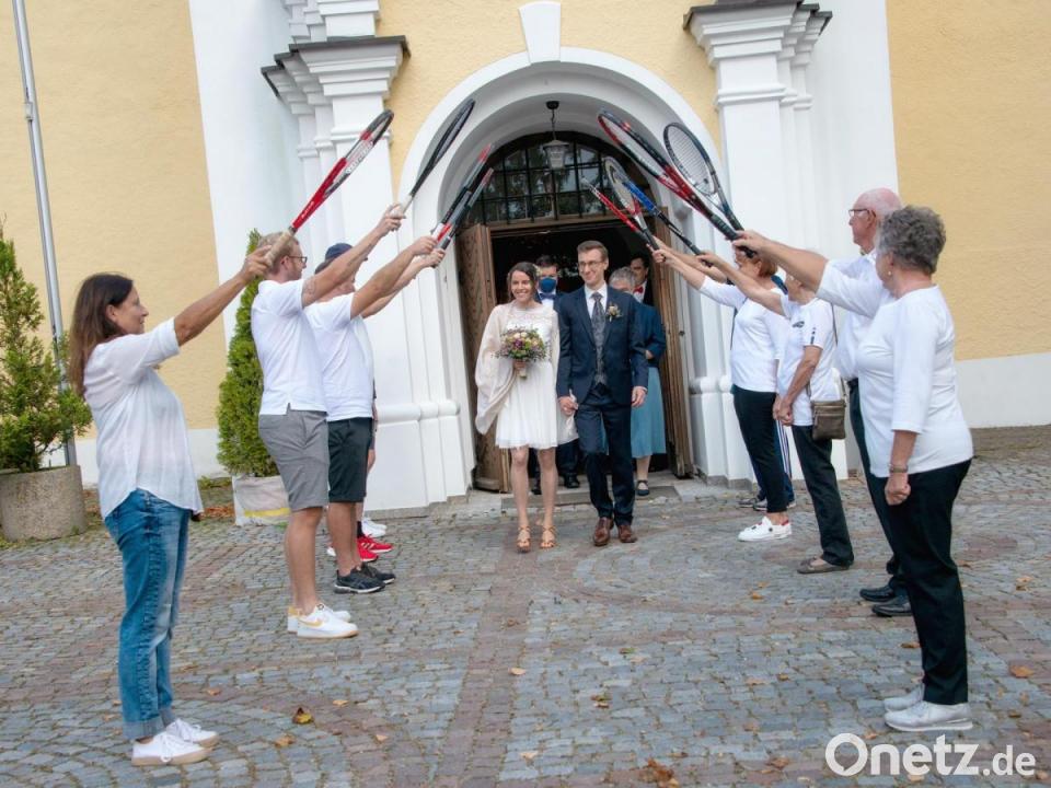 Mit einem Spalier, gestaltet durch Mitglieder der Tennisabteilung des 1. FC Schwarzenfeld, wurden Andrea und Jonas Bierler nach dem Trauungsgottesdienst in der Miesbergkirche überrascht. Als musikalische Gratulanten waren auch die Musiker der Musikkapelle Schwarzenfeld dabei, bei der Jonas als Schlagzeuger die ersten "Gehversuche" als Musikant erlernt hatte. Mit dem Dirigentenstab in der Hand des Bräutigams und ausgestattet mit der großen Trommel, umgehängt bei Braut Andrea, wurde ein Stück auf dem Kirchenhof intoniert. Kennengelernt hatten sich die aus Passau stammende Braut und der aktive Tennisspieler bei 1. FC Schwarzenfeld beim gemeinsamen Mathematik-Studium. Jonas Bierler ist seit 14 Jahren auf dem Tennisplatz sportlich aktiv und übte dort auch das Amt des Mannschaftsführers aus.