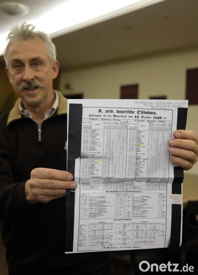 „Wir wollen tiefer in die Geschichte des Schwarzenfelder Bahnhofs eintauchen“, erklärt Gerhard Peter. Der Vorsitzende des Heimat- und Verschönerungsvereins hat deshalb einen Arbeitskreis gegründet und begibt sich auf Spurensuche. Die Inhalte dafür werden sich die Mitglieder des Arbeitskreises, die sich am Freitag erstmals im Restaurant Miesberg trafen, in diversen Archiven und vor allem im Verkehrsmuseum Nürnberg holen. Dort hat der ehemalige Heimatpfleger Peter Bartmann auch einen Fahrplan aus dem Jahre 1859 ausfindig gemacht, in dem bereits die Haltestation „Irrenlohe“ eingetragen ist.