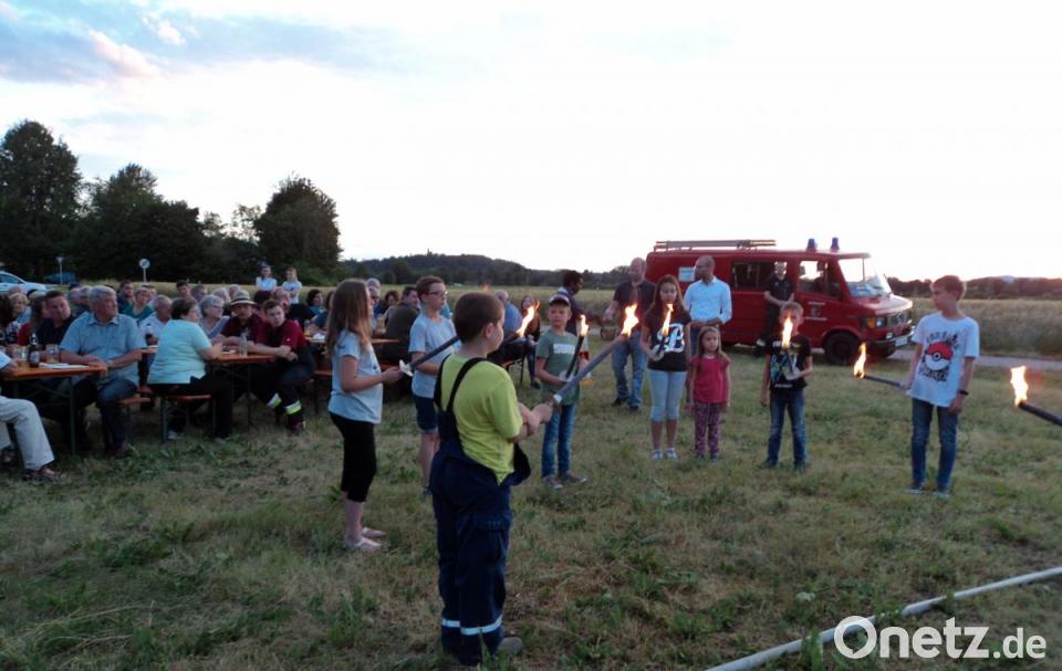 Bei Einbruch der Dunkelheit wurde das Feuer mit Fackeln entzündet. Pfarrvikar Joseph Kokkoth segnete das Feuer. Dann durften die Kinder mit Fackeln in den Händen den großen Holzhaufen anzünden. Ein lauer Freitagabend lud zum Verweilen ein. Die Feuerwehrmänner versorgten die Gäste mit Bratwürsten vom Grill und Getränken.