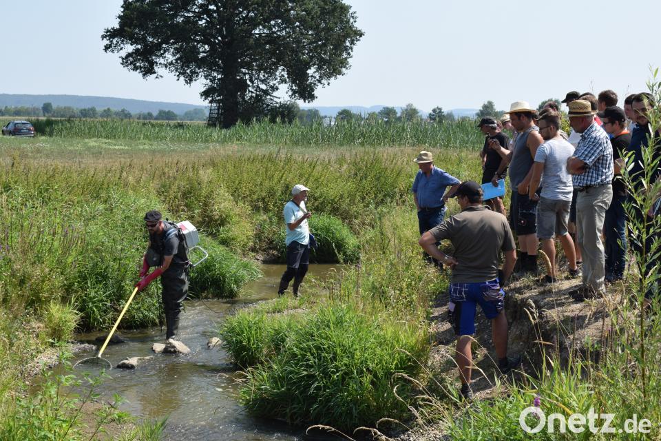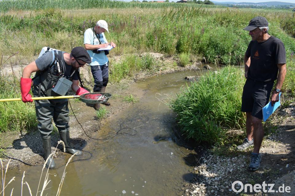 Geht man jedoch von Münchshof aus einige hundert Meter flussaufwärts, bietet sich ein ganz anders Bild mit einer völlig anderen Gewässerstruktur: breite Stellen, enge Stellen, Kurven, Gumpen, schnell fließende und langsam fließende Bereiche. Auf einer Länge von 150 Meter hat das Wasserwirtschaftsamt Weiden den Bachlauf in einen naturnahen Zustand zurückversetzt. Der Ausbauabschnitt am Fensterbach ist bereits der siebte Abschnitt, der in den letzten Jahren zwischen Wolfringmühle und Schwarzenfeld ausgeführt worden ist. Nicht ohne Stolz zeigt Anton Baumann, der zuständige Fachmann vom WWA Weiden, das bisher Erreichte. Aufweitungen und Mäander geben Fischen und anderen wasserbewohnenden Tierarten einen besseren Lebensraum. Ein ständiges Monitoring des Gewässers soll den Erfolg der Maßnahme jetzt auch dokumentieren und belegen. Mit dieser Aufgabe wurden Dr. Thomas Ring und sein Mitarbeiter Norbert Schwarz beauftragt. Beide sind ausgewiesene Experten der Bezirksfischereiberatung der Oberpfalz. Mit Hilfe des Elektrofischens wird der Bestand typisiert und genau gezählt. Was sich im ersten Moment als gefährlich anhört, bezeichnet Norbert Schwarz als völlig ungefährlich für die Fische. Ein kurzer Stromstoß narkotisiert die Fische für einige Sekunden und schon sind sie wieder quicklebendig. In einem schweren Gummianzug steigt der Fischexperte in den Fluss und taucht den Käscher unter Wasser. Ein kurzer Pipston - und schon wimmelt es im kleinen Netz. Das Ergebnis zaubert Thomas Ring und Anton Baumann ein breites Lächeln ins Gesicht. Obwohl dieser Gewässerabschnitt erst im September 2016 renaturiert worden ist, tummeln sich Nase, Laube, Gründling, Hasl, Barbe und Eitel im Fanggerät. Sogar ein kleiner Hecht hat sich darin verfangen. Schnell wird gezählt und aufgeschrieben und schon verschwinden die Fische wieder im Wasser.