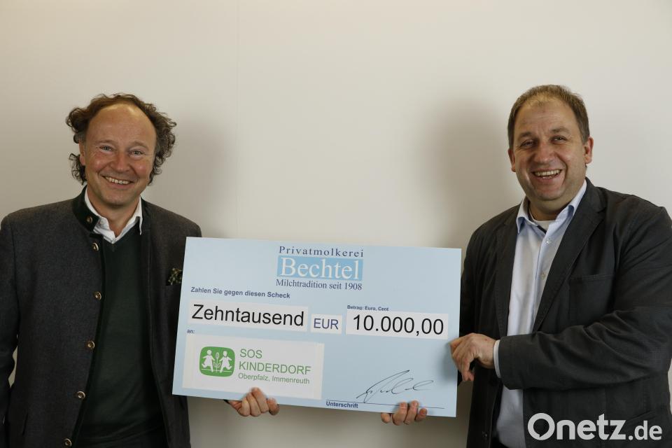 Schon seit 2019 unterstützt die Privatmolkerei Bechtel das SOS-Kinderdorf Oberpfalz in Immenreuth. Gerade in dieser schwierigen Corona-Pandemie ist es dem Unternehmen nach eigenen Angaben wichtig, einen Beitrag für die Arbeit und Maßnahmen um das Wohlergehen der Kinder im SOS-Kinderdorf mit seinen Familien zu leisten. Dort leben derzeit 68 Kinder und Jugendliche. Kürzlich übergab René Guhl, Geschäftsführer der Privatmolkerei Bechtel, an den Leiter des SOS-Kinderdorfes Oberpfalz in Immenreuth, Holger Hassel, einen Scheck in Höhe von 10 000 Euro. Hassel war sehr beeindruckt von der erneuten großzügigen Spende. Sie trage dazu bei, "dass wir Kindern und Jugendlichen, die aus verschiedenen Gründen nicht zu Hause aufwachsen können, eine neue, zeitlich befristete oder auch dauerhafte Heimat geben können." Mit der Spende werde das Kinderdorf unterstützt, den Kindern ein gutes, kindgerechtes Leben zu ermöglichen und sie in ihrer Entwicklung gut zu fördern.