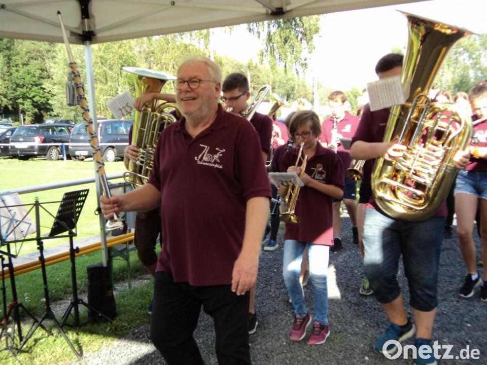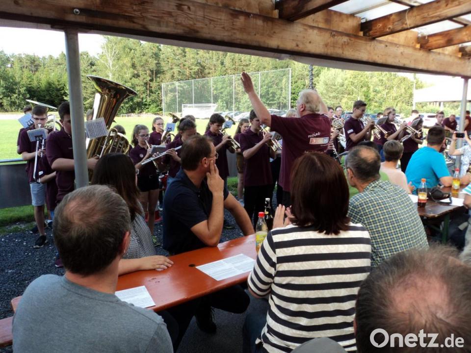 Die Musiker haben ein Faible für den Sportplatz des SV Trsiching/Rottendorf entwickelt. Das sechste Mal in Folge schlugen sie ihre Zelte hier auf. Hotel Mama mit Couch und Handy wurde mit dem Feldbett getauscht. In vier großen Zelten campten die 39 jungen Musiker fünf Tage lang. Neben Spiel und Spaß gehörten feste Probenstunden zum Tagesablauf. Susanne Lindner kochte mit ihrem bewährten Team das abwechslungsreiche Essen in der Feldküche. Am Besuchertag freute sich Vorsitzende Kristina Betz über die Anwesenheit vieler Eltern und Angehöriger. Der Gottesdienst – zelebriert von Pater Alban vom Miesberg – wurde von den jungen Musikern gestaltet. Burkhardt Weber dirigierte das Orchester beim Einzug, für den der Marsch „Schloss Leuchtenberg“ von Sepp Thaler gewählt wurde. Danach gab es natürlich weitere musikalische Kostproben. Das Repertoire reichte vom Marsch "Mondschein an der Eger“ bis hin zu Udo Jürgens „Eine neue Liebe ist wie ein neues Leben“. Der Abend war – ein Hit. Betreut wurden die Nachwuchsmusiker von Jugendleiter Andreas Karl.
