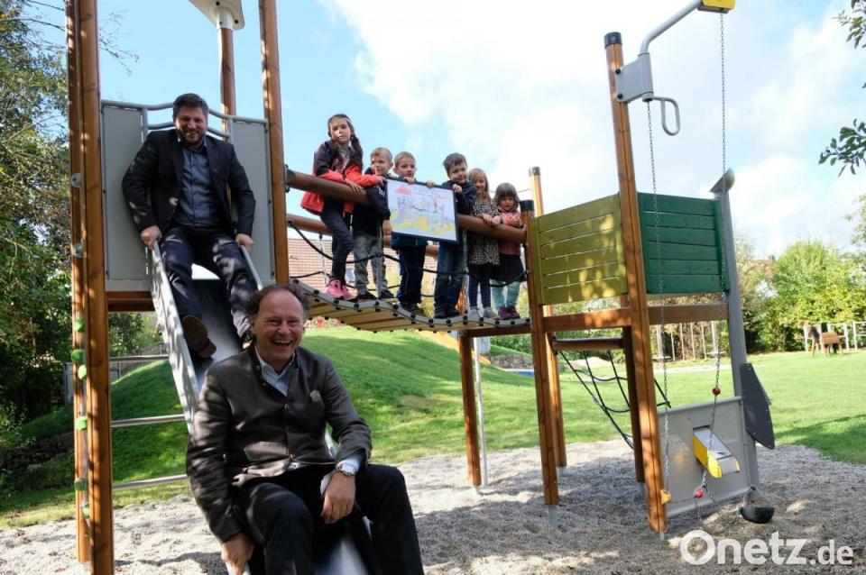 Im Dezember letzten Jahres hatten sie es versprochen, Bürgermeister Peter Neumeier und Geschäftsführer Renè Guhl von der Privatmolkerei Bechtel: "Wenn der neue Spiel- und Kletterturm für den Kindergarten "Villa Kunterbunt" aufgebaut ist, rutschen wir gemeinsam". Sponsor und Marktoberhaupt haben das Versprechen – zur Freude der anwesenden Kinder – nun eingelöst. Neumeier und Guhl hatten dabei auch ihren ganz persönlichen Spaß. Zur Erinnerung: Eine Summe von 20000 Euro hatten die Milchwerke für das Spielgerät zur Verfügung gestellt. Die Kinder dankten mit einem selbst gemalten Bild, das sie auf dem Spielturm präsentieren.