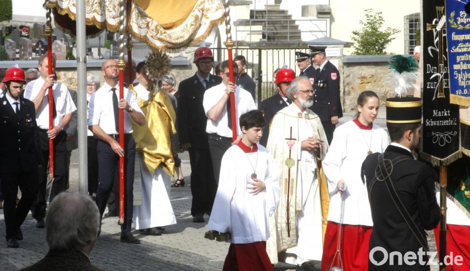 In den Zug reihten sich Vertreter kirchlicher und weltlicher Vereine ein, begleitet von der Blaskapelle und vom Kirchenchor. Den Ministranten und Kommunionkindern folgte das „Allerheiligste“ unter dem „Tragehimmel“. Mit der Monstranz erteilte Pfarrer Heinrich Rosner an den Altären den Segen. Chorleiter Michael Koch stimmte den Psalm „Christus Sieger, Christus König, Christus Herr in Ewigkeit“ an. Auf dem Weg zu den Altären erklangen Fürbitten: „Herr, gib uns die Kraft zur Demut“. Der „Prangertag“ endete mit einer weltlichen Feier auf dem Kirchenvorplatz. Vertreter der katholischen Verbände hatten unter den Bäumen Tische und Bänke aufgestellt und luden zum Bratwurstessen ein.