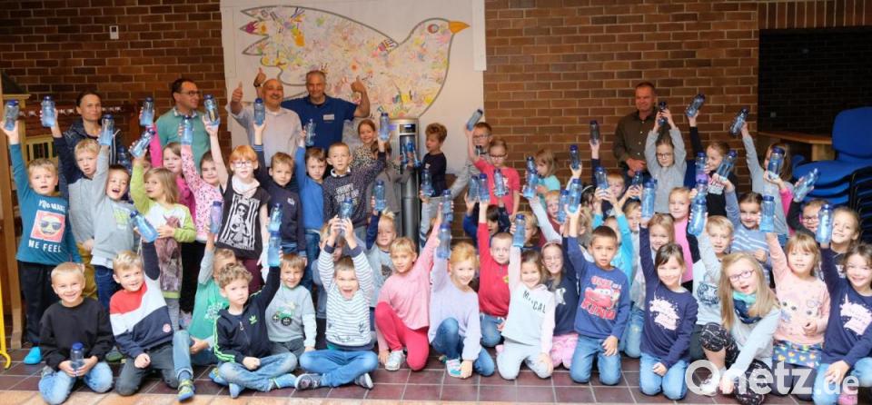 Davon können die meisten Kinder auf der Welt nur träumen: Frisches Trinkwasser in unbegrenzter Menge aus einem Spender zapfen. Und dabei auch noch unterscheiden zu können, ob spritzig, medium oder still. In der Grund- und Mittelschule Schwarzenfeld steht ab sofort ein Wasserspender in der Aula zur Verfügung, der alle hygienischen Anforderungen erfüllt. Dieser soll die Kinder zum Trinken von „Schwarzenfelder Brunnenwasser“ animieren – als einen Beitrag zur gesunden Ernährung im Rahmen der Schulverpflegung. Elternbeirat und Förderverein unterstützen die Sache wohlwollend und spendierten den Schülern der drei ersten Klassen (Schwarzenfeld und Stulln) knapp einhundert Trinkflaschen. „Weshalb braucht der Körper Wasser, und wie viel sollte man täglich trinken?“ Diese und weitere Fragen richtete Schulleiter Siegfried Seeliger bei der Übergabe der Trinkflaschen an die Mädchen und Jungen. Die Schulneulinge zeigten, dass sie hier schon einiges wissen. Denn wie aus der Pistole geschossen gab es jede Menge sinnvoller Antworten.